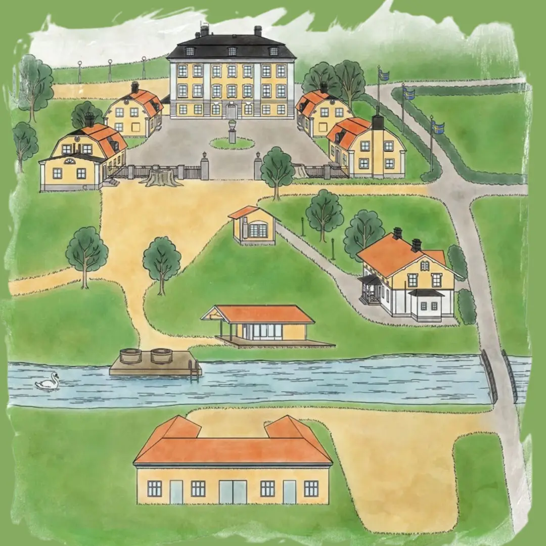 Områdeskartan ger en överblick över herrgården, byggnaderna runt omkring och naturen som ramar in hela vistelsen. Allt finns nära, men inget stör.