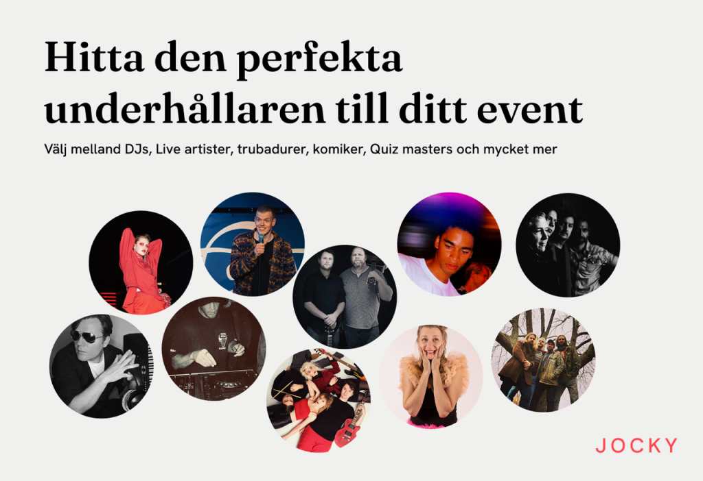 Genom Jocky har vi tillgång till en skräddarsydd artistkatalog, framtagen exklusivt för evenemang på Schenströmska. Här hittar du ett brett urval av DJs, trubadurer, liveband, komiker, quizmasters och mycket mer – alla verifierade och rekommenderade av hotell och restauranger runt om i Sverige.